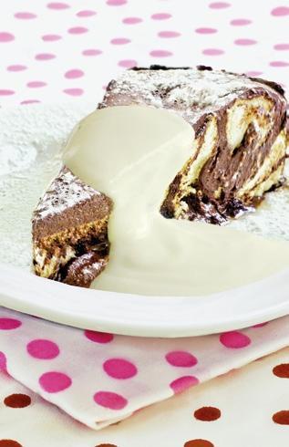 Vodu smícháme s kakaem a za stálého míchání zahřejeme, ale nevaříme. Necháme vychladnout. Mezitím si vyšleháme změklé máslo s cukrem a žloutky do pěny. Obě hmoty spojíme (měly by mít přibližně stejnou teplotu), přidáme piškoty a důkladně promícháme. Naplníme do dortové formy, navrchu pěkně uhladíme stěrkou a necháme v lednici 1 den proležet. Podáváme zdobené ušlehanou smetanou.